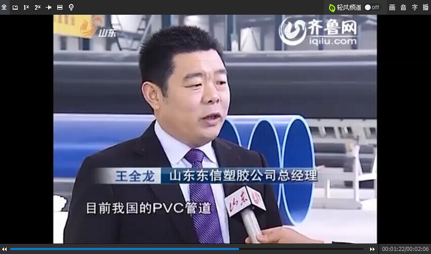 山东卫视报道:东信塑胶实现全球最大口径PVC管道产业化,在采访中,我公司总经理王全龙说到:“目前我国的PVC管道最大口径是80公分,欧美是1.2米,我们东信公司生产的1.6米的PVC管道,已经实现了产业化,也可生产2米的PVC管道。” 眼下城市建设和南水北调等大型工程对大口径管道需求旺盛,这一突破也让企业订单供不应求。