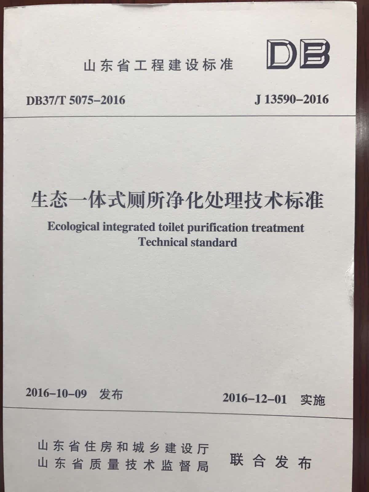 由山东省建设发展研究院和山东东信塑胶有限公司主编的《生态一体式厕所净化处理技术标准》业经审定通过,批准为山东省工程建设标准,编号为DB37/T5075-2016,现予以发布,自2016年12月1日起施行。