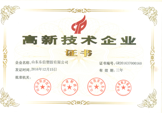 山东东信塑胶有限公司践行社会责任服务社会大众,注重经验积累和人才培养,不断改进创新,近期我公司又先后荣获《高新技术企业》、《山东名牌》两项荣誉,再次彰显了东信公司卓尔不群,崇尚品质,追求卓越的品质。